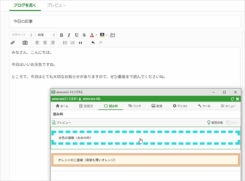 アメブロの標準とは違う、ネットで見つけた「囲み枠」も、囲みたいところを選択してボタンを押すだけで簡単に貼り付け可能。
