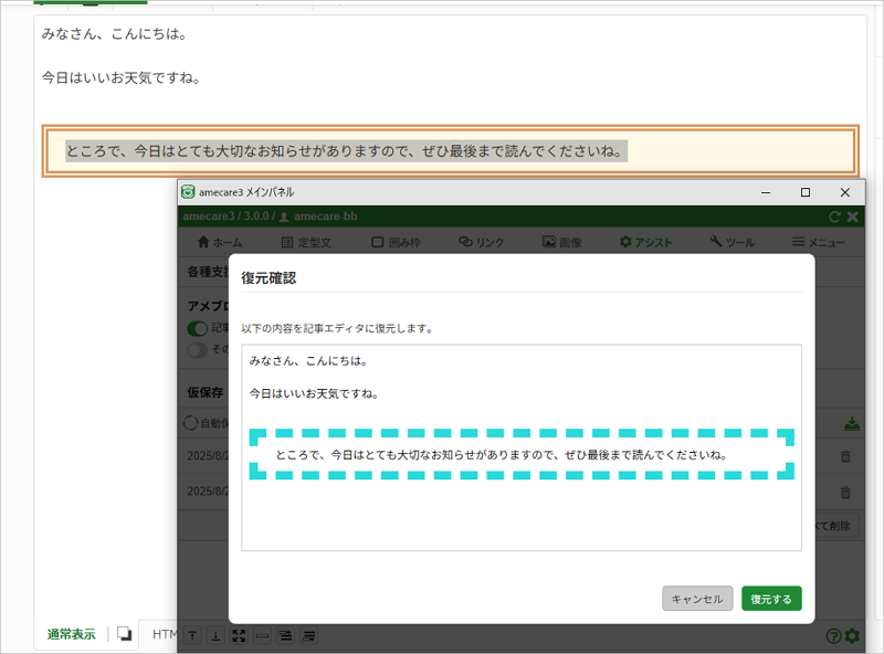 PCやブラウザが突然ダウンしてしまったり、記事を書いていて何故かグチャグチャになってしまった場合でも、簡単にトラブル前の状態に戻すことができます。