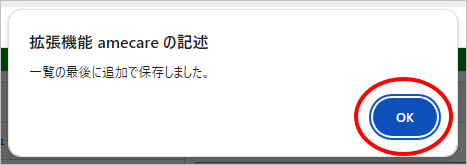 「一覧の最後に追加で保存しました。」というメッセージが表示されれば保存は成功です。メッセージは「OK]ボタンを左クリックして閉じてください。