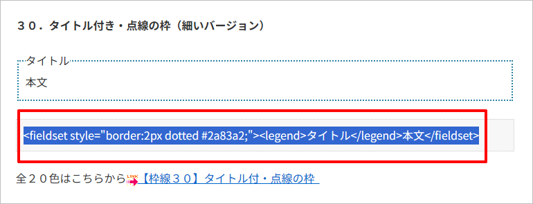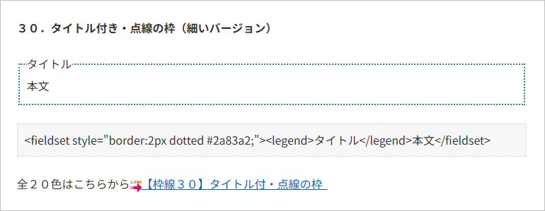 記事タイトルからも想像できる通り多くの囲み枠のタグが紹介されていますが、その中から、「30.タイトル付き・点線の枠(細いバージョン)」という囲み枠を選んでみました。