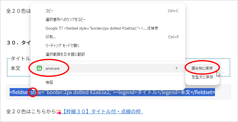そして、選択したタグの位置でマウスを右クリックし、右クリックメニューの中の「amecare」という項目までカーソルを移動、横に出た小さなメニューの「囲み枠に保存」を左クリックして下さい。