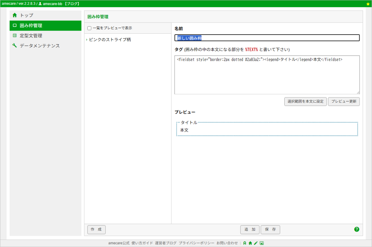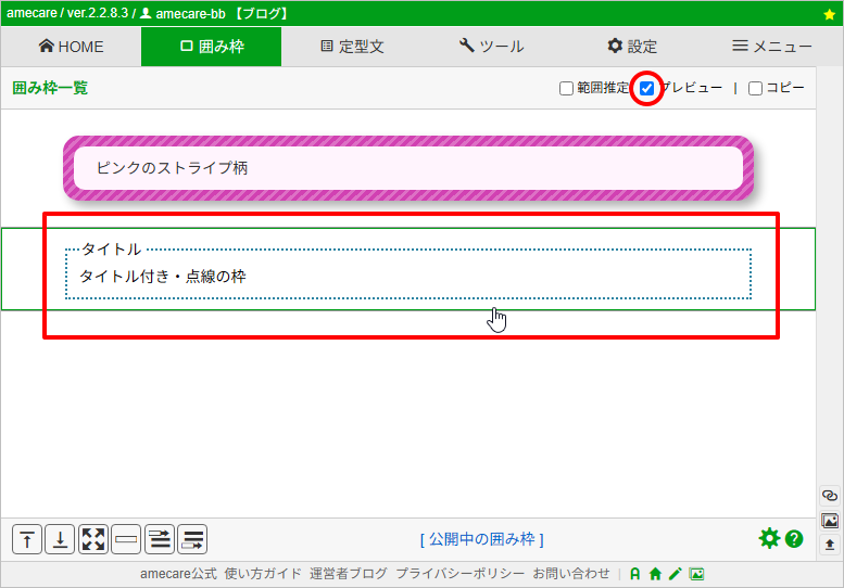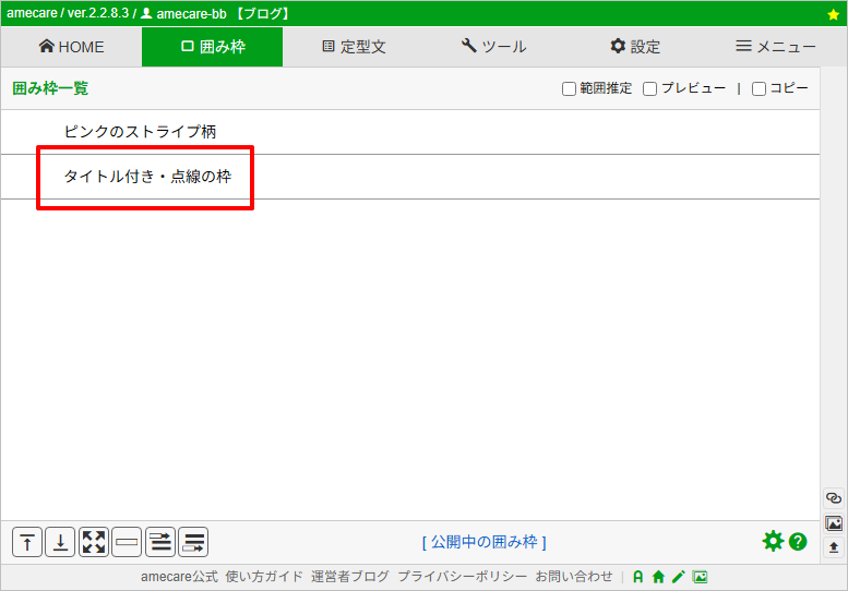 前回記事で、amecareの公式サイトで公開している囲み枠を簡単に登録して利用する方法をご紹介しました。
