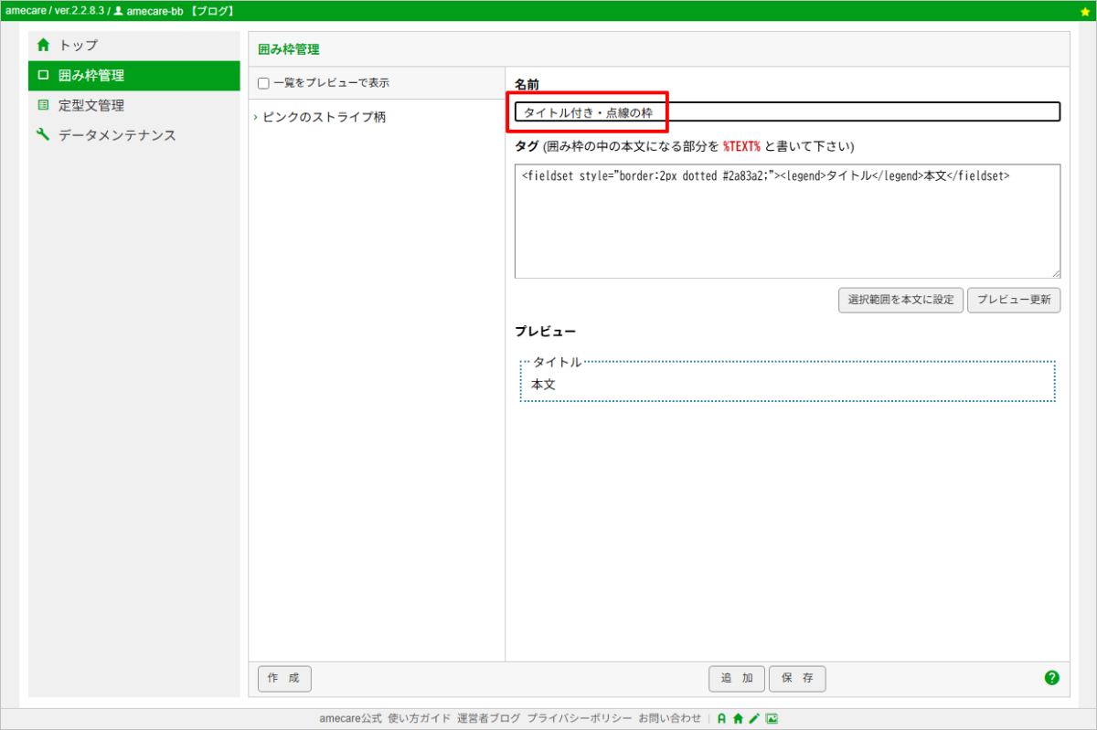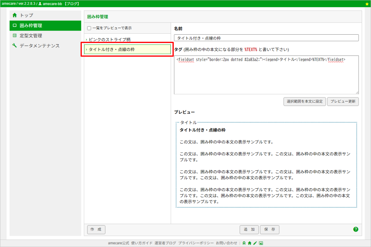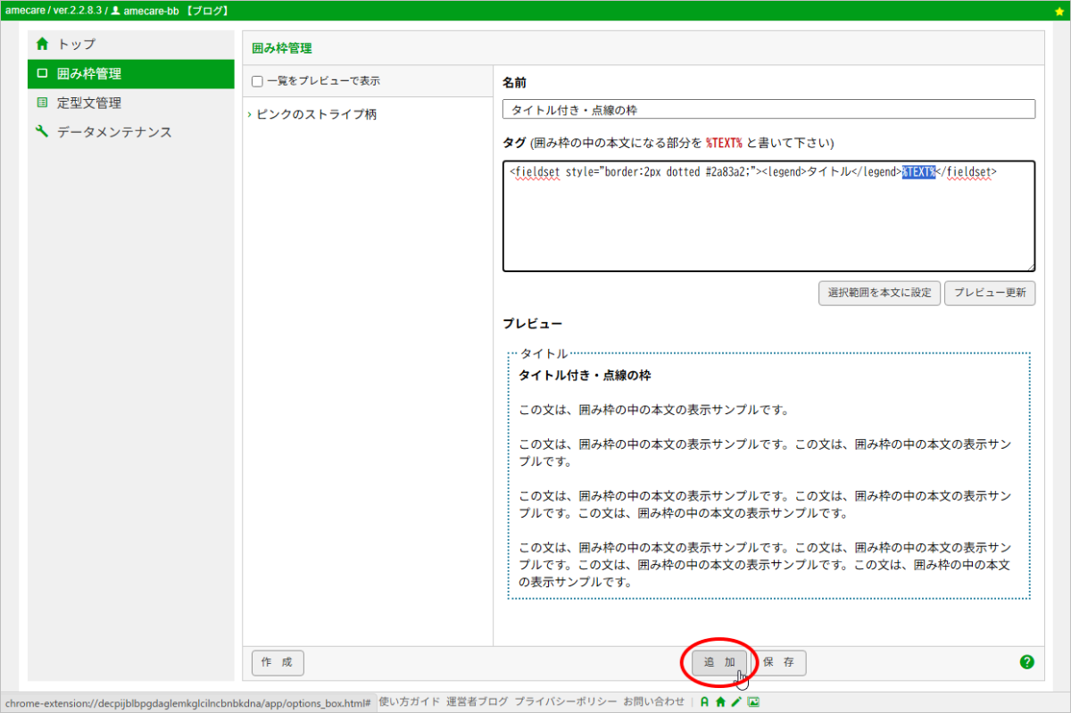 囲み枠のタグをamecareに保存する