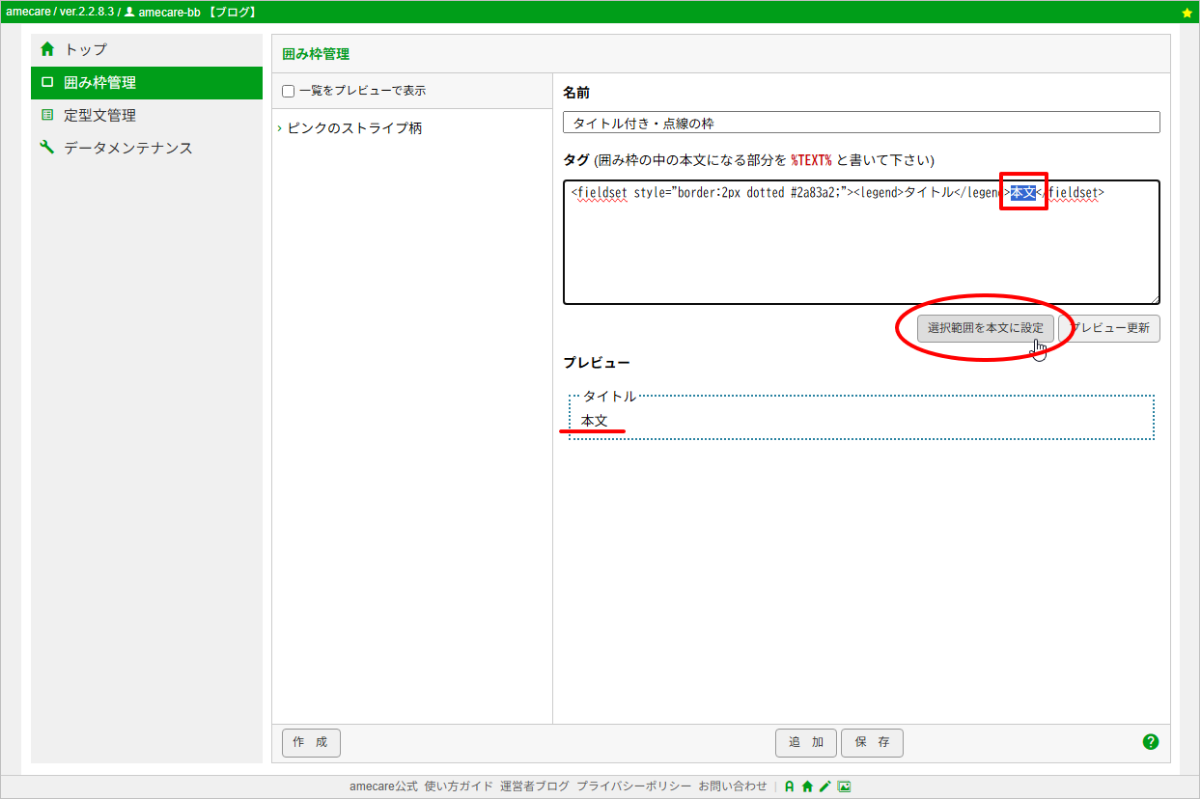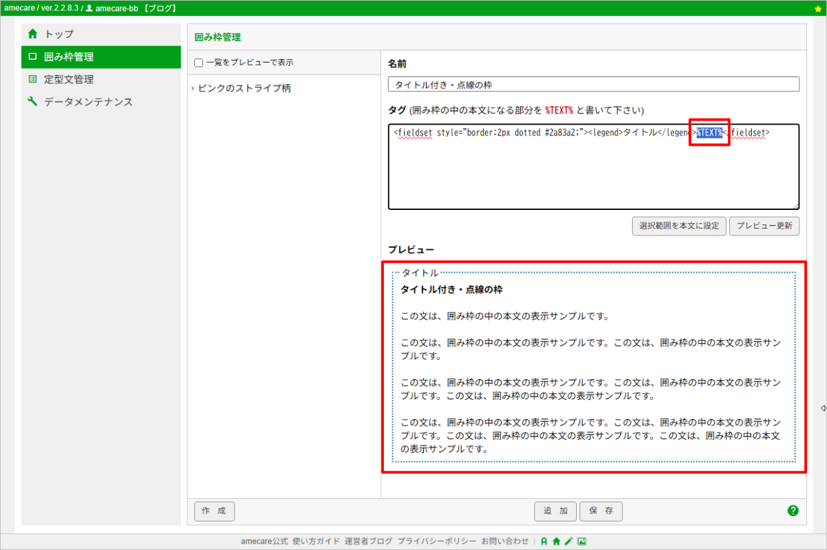 前項の操作により、下の画像のように、囲み枠のタグがセットされた状態で、amecareの「囲み枠管理」画面が開きます。