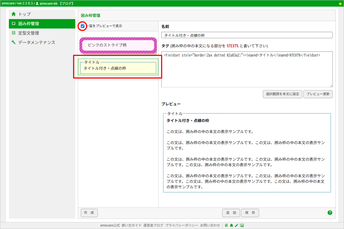 囲み枠の保存に成功すると、下の画像のように一覧の最後に囲み枠の名前が追加されます。