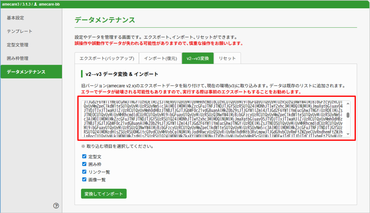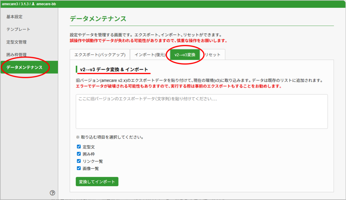 設定ページが開いたら、左側のメニューから「データメンテナンス」をクリックし、さらに開いた画面の「v2→v3変換」タブをクリックして、「v2→v3 データ変換 & インポート」画面を開きます。