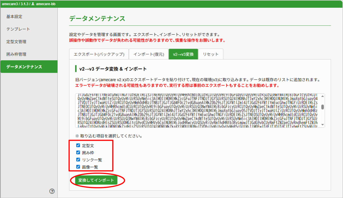 最後にインポートしたいデータの種類(定型文、囲み枠など)にチェックが入っていることを確認し、「変換してインポート」ボタンをクリックします。