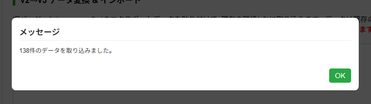 「○○件のデータを取り込みました。」のようなメッセージが表示されれば、データ移行は成功です。