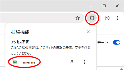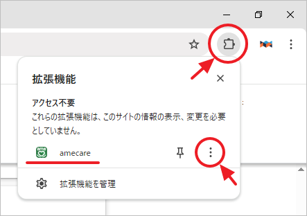 拡張機能のアイコンを固定(常時表示)していない場合は、ジグソーパズルのアイコンをクリックして表示されるメニューから「amecare」を探し、その右の三点メニューボタンをクリックすると「拡張機能を管理」が表示されます。