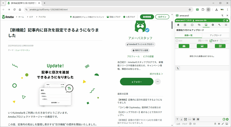 以上、amecare3の基本的な使い方をいくつかご紹介しました。まずはこれらの機能を試してみて、快適なアメブロの記事作成・編集を体験してみてください。