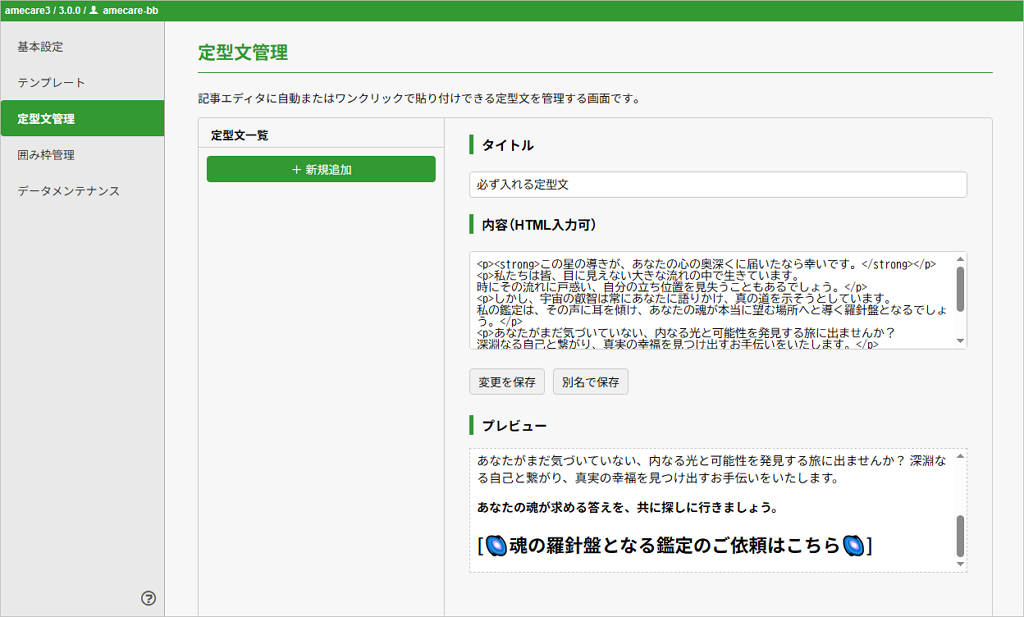毎回同じように入力する文章やHTMLコードは、「定型文」として登録しておくとワンクリックで記事に挿入できて便利です。また、任意に設定した定型文を、新規記事作成時に自動挿入することもできます。