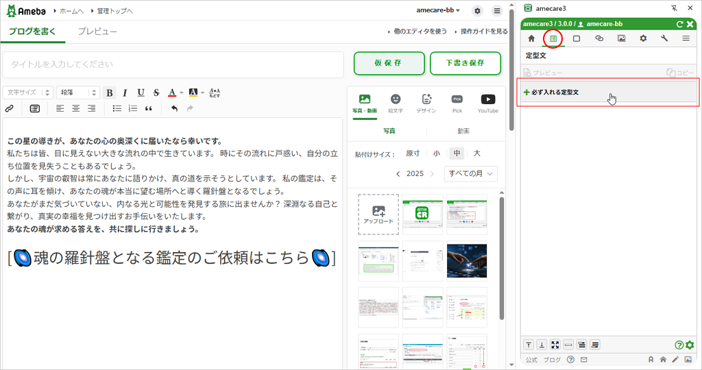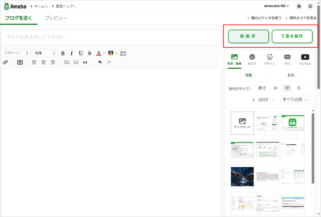 • 仮保存ボタン: 編集中の記事のタイトルと本文を、ブラウザ内(amecare3専用の保存領域の中)にバックアップします。アメブロに保存されるものとは別に15世代までバックアップできるので、アメブロの下書きや自動保存では対応できない場合でも、ここから復元できる可能性があります。