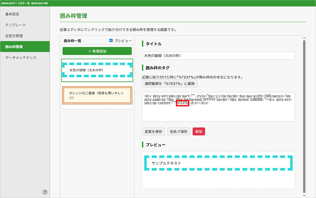 定型文と同様に、設定画面の「囲み枠管理」から登録します。内容を入力する際に、装飾したい本文が入る場所を%TEXT%という特別な目印に置き換えて記述するのがポイントです。