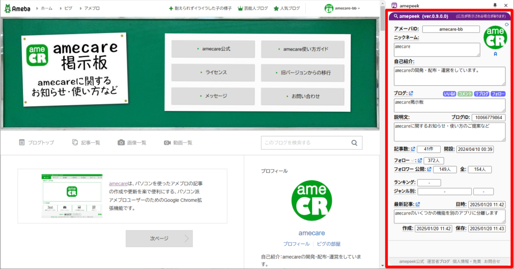 amecareの関連ツールとして、amepeekという無料のChrome拡張機能を公開しました。 パソコン版のGoogle ChromeやMicrosoft Edgeなどで動作します。 amepeek - Chrome ウェブストアブラウザで見ているアメブロの設定内容や運用状況などの概要を簡単に見ることができるChrome拡張機能ですchromewebstore.google.com ブラウザに追加後、amecareと... -