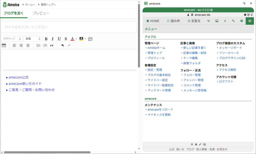 いつもamecareをご愛用いただきありがとうございます。 (以前お知らせした内容と変わりましたので再度お知らせします) 現在、amecareの新バージョンとなる「amecare ver.3」を開発中です。 遅くとも今年の夏中には公開できる見込みです。 ver.3は、これまでのamecareとは異なり、amepeek や amestyle のように、ブラウザのサイドパネルでも... -